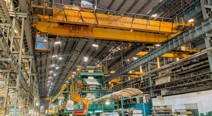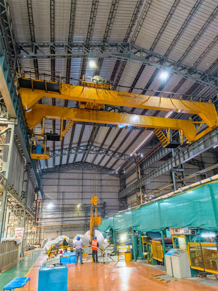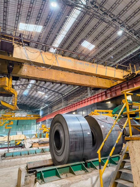 Rolling mills E.O.T. Cranes are heavy duty made to work in harsh, abrasive and high temperature situation. They are used for maintenance purpose of machines, mills. They helps in material flow throughout the rolling mill from hot to cold steel. These cranes are suited for steel rolling mill, coil handling and mill maintenance.